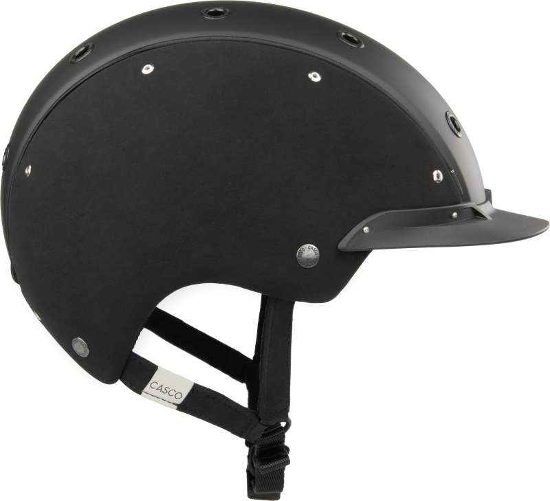 Die elegante Kombination aus mattschwarzer Helmschale und seitlichen Einsätzen aus feinem Nubukleder in Black Velour verleiht dem Helm eine besonders hochwertige Optik – ideal für Reiterinnen und Reiter mit Stilbewusstsein.
