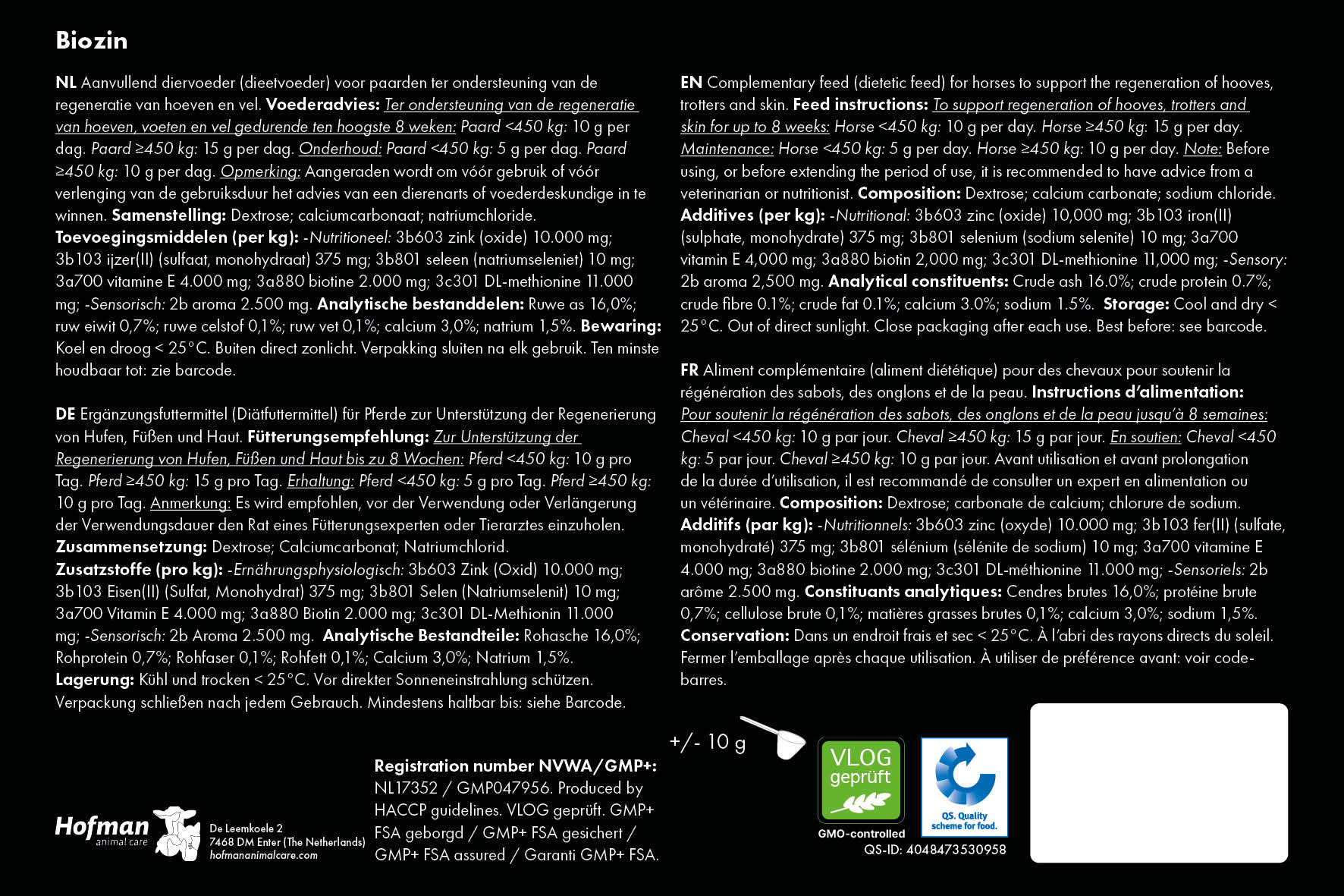 • Biozin zur Unterstützung der Konsistenz und Struktur des Hufhorns, Fells und der Haut des Pferdes.