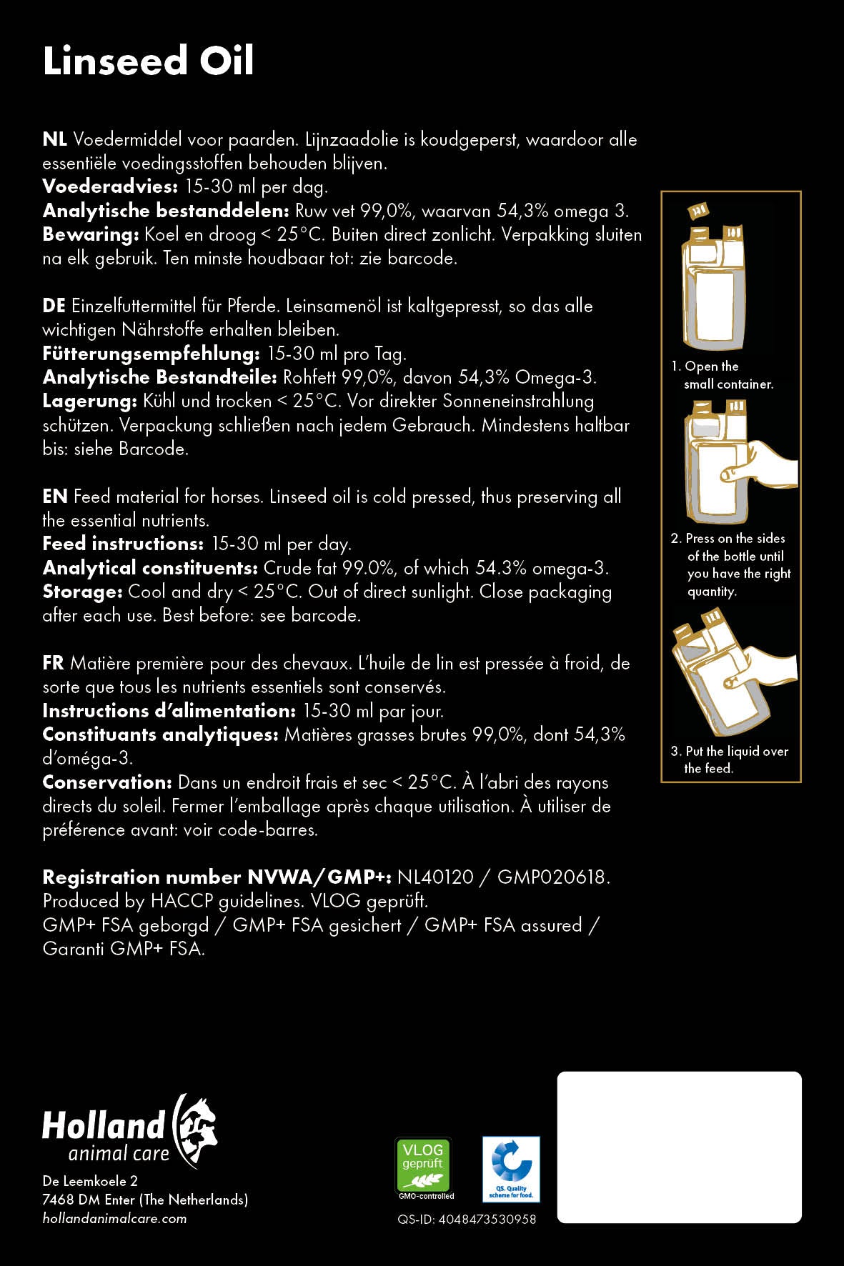 Außerdem ist dieses Produkt GMP+ FSA gesichert. Das heißt, es erfüllt alle Qualitätsanforderungen für eine optimale Pferdegesundheit. Die Fütterungsempfehlung ist 15-30 ml pro Tag, je nach Größe des Pferdes. Zur einfachen Abmessung der Mengemit einem Kanister kann eine Pumpe oder ein Krahn hinzugefügt werden.