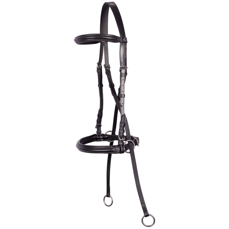 Diese gebisslose Ledertrense in elegantem Schwarz kombiniert höchsten Komfort mit feiner Kontrolle. Weich gepolsterte Stirn- und Nasenriemen sorgen für Druckentlastung und verhindern Scheuerstellen. Die kreuzweise Zügelführung über Kinn und Genick ermöglicht eine besonders sanfte Einwirkung, ideal für sensible Pferde oder eine schonende Ausbildung. Komplett mit Gurtbandzügeln mit Stegen und einer detaillierten Anleitung zur richtigen Verschnallung gewährleistet diese Trense eine passgenaue und sichere Anwendung. Erhältlich in den Größen Full und Cob.